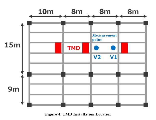 As a countermeasure, three TMDs (mass: 1200 kg) were installed under the floor to reduce vibration.
