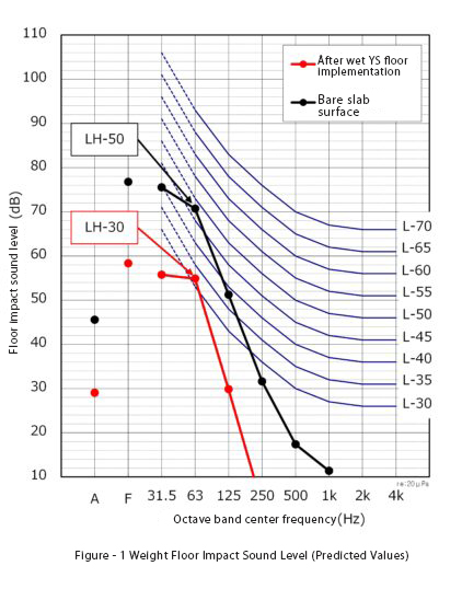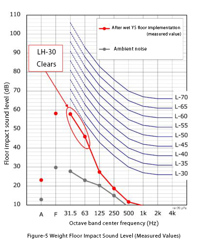 The measurement results showed that the heavy floor impact sound level on the wet YS floor was rated “LH-30,” confirming that the heavy floor impact sound from the upper floor was significantly reduced on the lower floor (Figure-5).