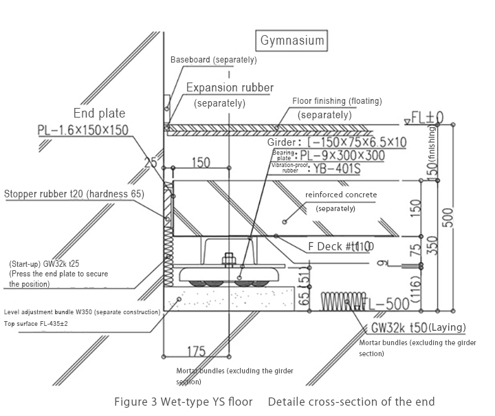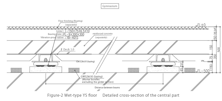To prevent heavy floor impact noise, a wet YS floor as shown in Figure-2 and Figure-3 was installed in the (upper floor) gymnasium floor.