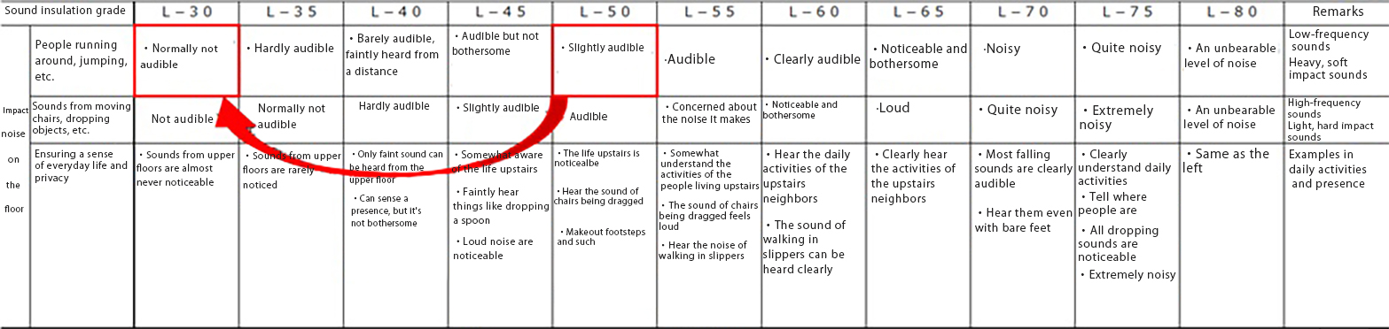 The results of the predictive study showed a heavy floor impact sound level of LH-50 (low sounding) on the bare slab※2surface with no countermeasures.