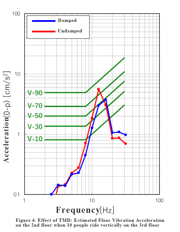 Without any measures taken by TMD, the vibration is above V-70, but with vibration control measures, it is around V-50. This is the “not very bothersome” level in the evaluation of the new standard (AIJES-V0001-2018 Occupant Performance Evaluation Standard for Building Vibration), which means that an appropriate vibration environment is ensured even during fitness-for-service operations.