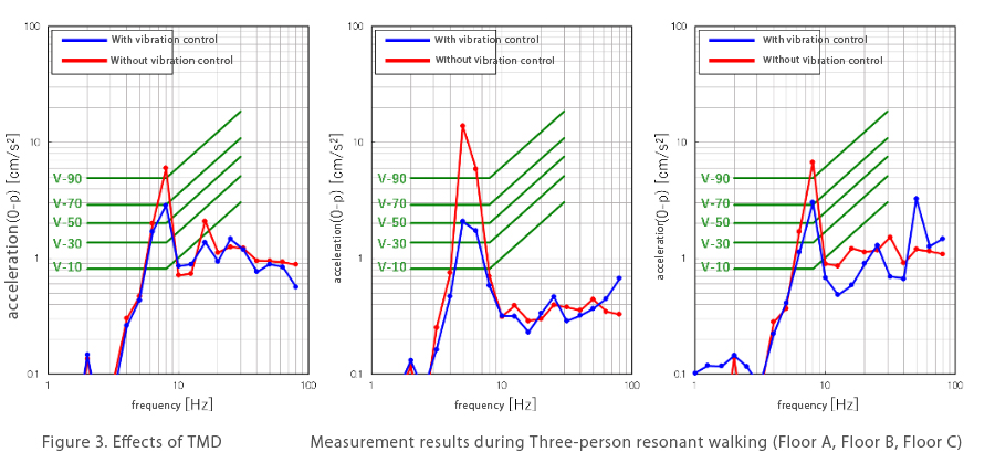 When vibration control was applied, vibration was reduced to about half for floors A and C, and the occupant comfort rating was V-70, indicating an improvement to a good environment for office use. Floor B, which had the highest vibration, was also reduced to about V-50, demonstrating the effectiveness of vibration control by TMD.
