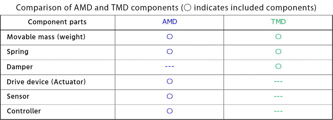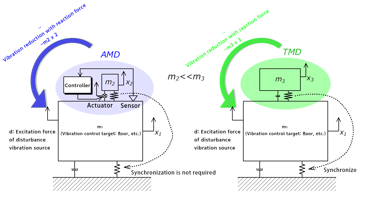 AMD (=Active Mass Damper) and TMD (=Tuned Mass Damper) are both vibration control devices called mass dampers. The TMD absorbs vibrations in the resonance range of the floor by tuning the weight/spring to the natural frequency of the floor, while the AMD absorbs vibrations in the resonance range of the floor by controlling the reaction force to absorb vibrations by actively moving the weight with the power of a motor. A comparison of the mechanical model and the hardware configuration of the device is shown below.