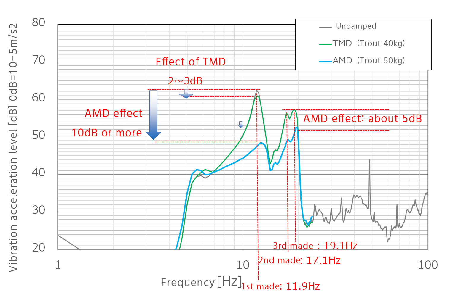 There are three natural vibration modes at 11.9 Hz, 17.1 Hz, and 19.1 Hz, and their spectra are outstanding, but in the case of TMD, only the tuned first-order mode shows an effect of 2-3 dB. On the other hand, AMD reduces all first-order to third-order modes, and the amount of effect is much larger than that of TMD, with more than 10dB for the first-order mode and about 5dB for the second- and third-order modes.