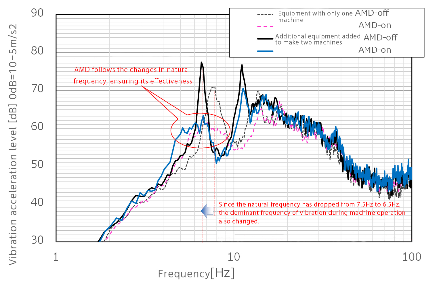Here is an example of AMD tracking such a change in the natural frequency of the floor. At a certain factory, after AMD was introduced to improve the working environment due to production equipment vibration, a new production equipment line was added, and the natural frequency of the floor changed from 7.5 Hz to 6.5 Hz, which is quite low. The following figure shows the result of adjusting software parameters to keep up with this change and continue to demonstrate its effectiveness.