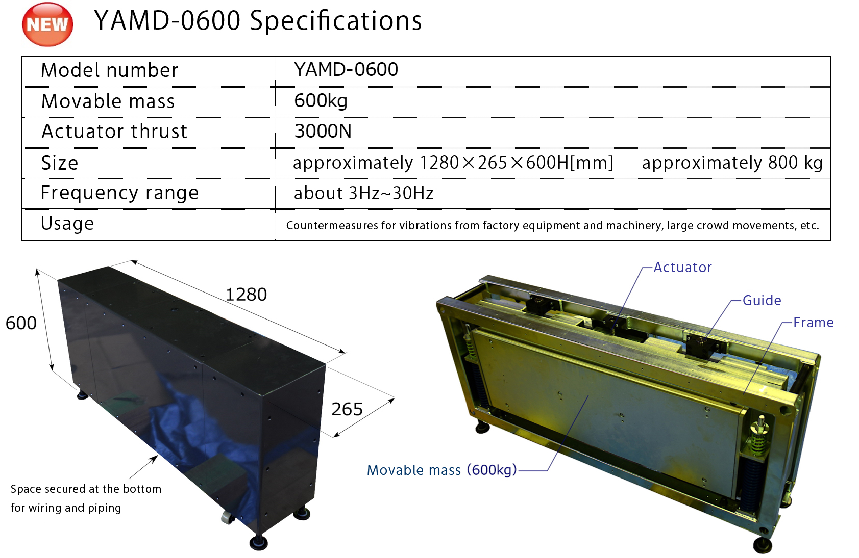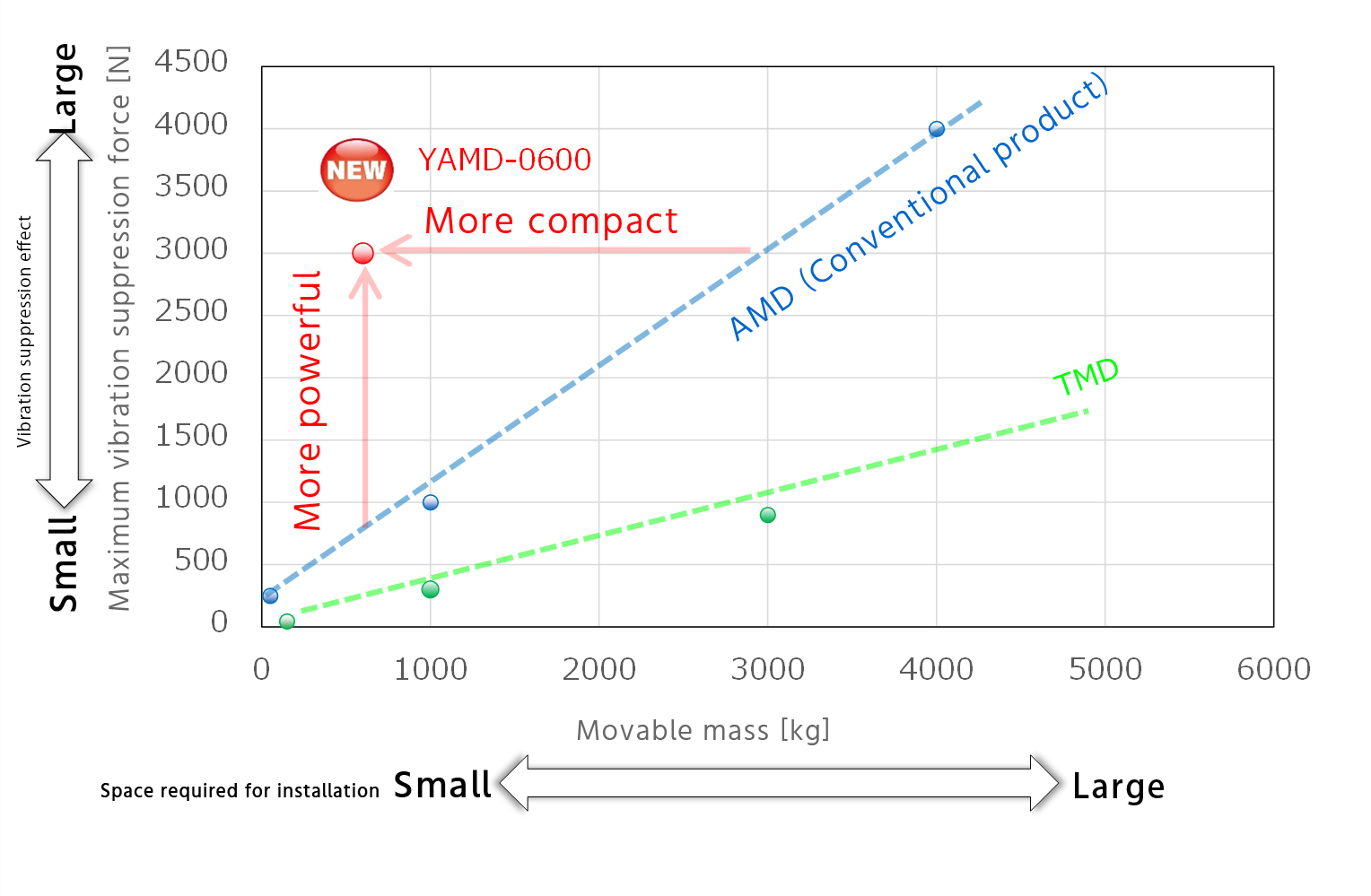 The figure below summarizes and compares the relationship between the movable masses and the effect ≈ (damping force = reaction force of AMD and TMD). It can be seen that AMD requires a much smaller mass than TMD to achieve the same effect (force to damp vibration). In addition, the (NEW) YAMD-0600 equipped with an AC servo & ball screw type actuator, which has been developed for factory production equipment, has even greater thrust and is more compact than the previous AMD equipped with a linear motor.