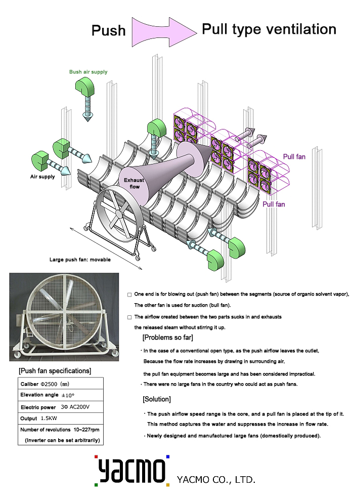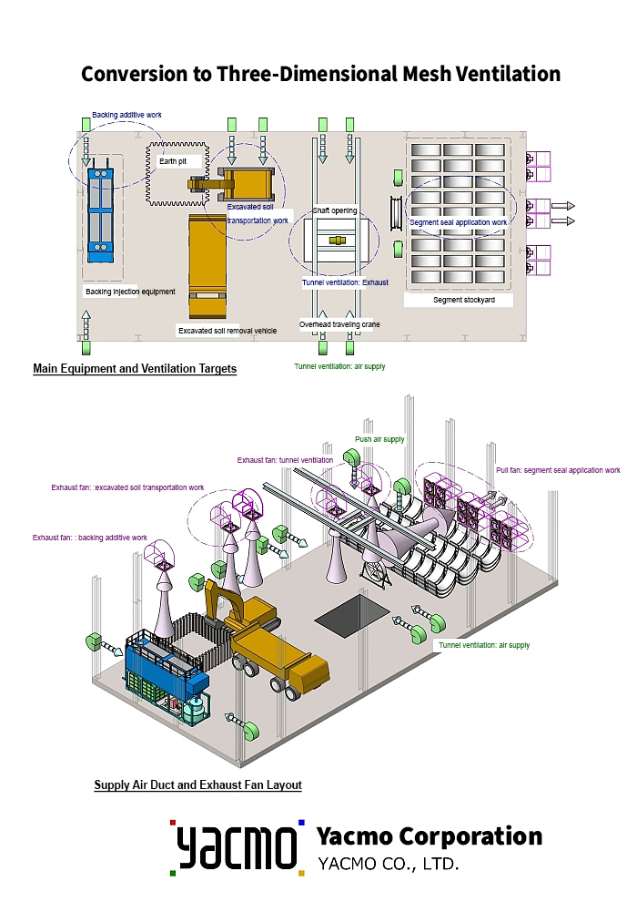 We have developed a “three-dimensional mesh ventilation system” that manages the ventilation airflow in the work space three-dimensionally in order to efficiently provide the necessary ventilation for each type of work and work area in soundproof houses. The ventilation system developed controls the direction and volume of ventilation airflow in the work space by arranging air supply ducts, push fans, pull fans, and exhaust fans in a three-dimensional manner for each type of work and work area.