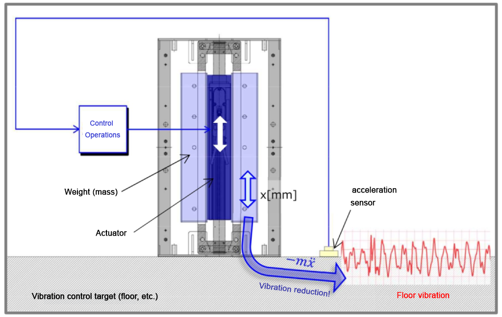Vibration of the vibration control target (floor, etc.) is monitored by acceleration sensors, control calculations are performed in real time to reduce the vibration, and the actuator drives the vibration mass.