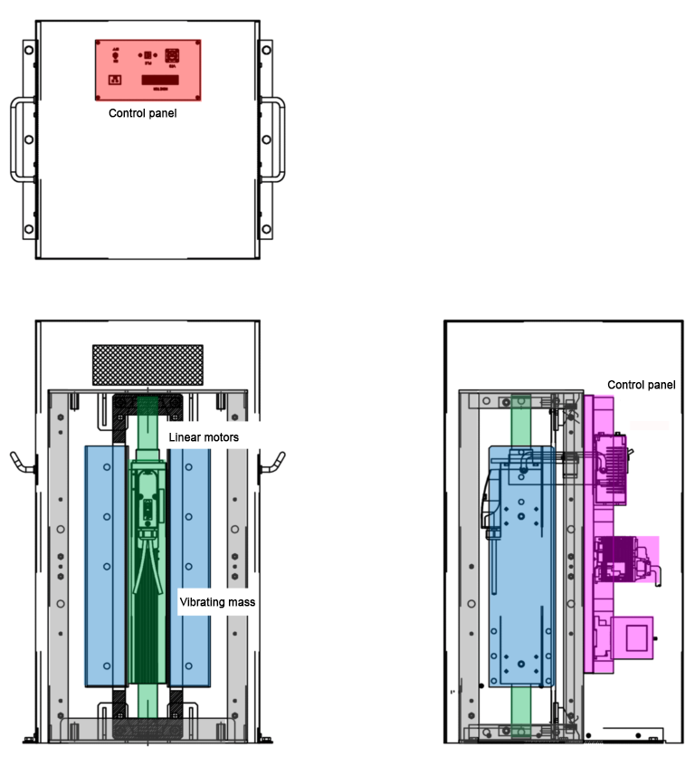 It consists of an actuator, vibration mass, coil spring, frame, control panel, and acceleration sensor.