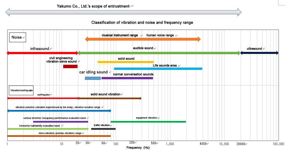 Tokyo Metropolitan Permit No. 1363 (Vibration acceleration level) - As shown in the figure below, we can provide measurement and study of countermeasures for all types of vibration up to earthquakes, in addition to equipment vibration and daily life vibration.