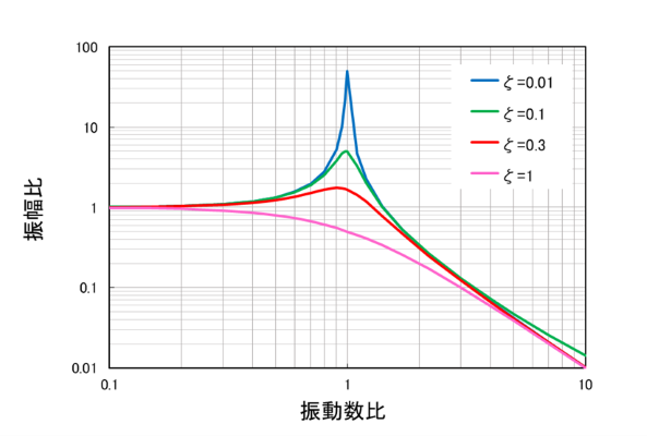 This shows that the smaller the damping ratio (ζ), the sharper the peak at resonance and the greater the amplification due to resonance. In other words, the smaller the damping ratio, the greater the risk of large vibration due to resonance.