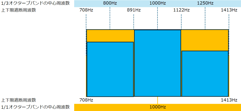 例えば、1000Hzの場合は下限周波数 710Hz〜上限周波数 1400Hzの音が含まれます。