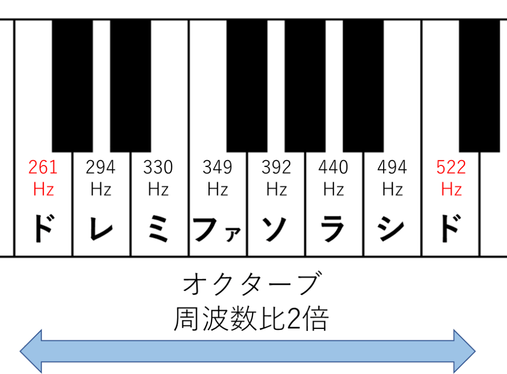 最初のドが約261Hz(1秒間に261回振動)、次のドが約522Hzでこの2音が2倍の関係になっていることをオクターブといいます。