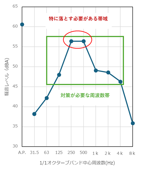 オクターブバンド分析の結果、125Hz〜4kHz の帯域、特に 250Hz と 500Hz の音が大きいことが判明しました。